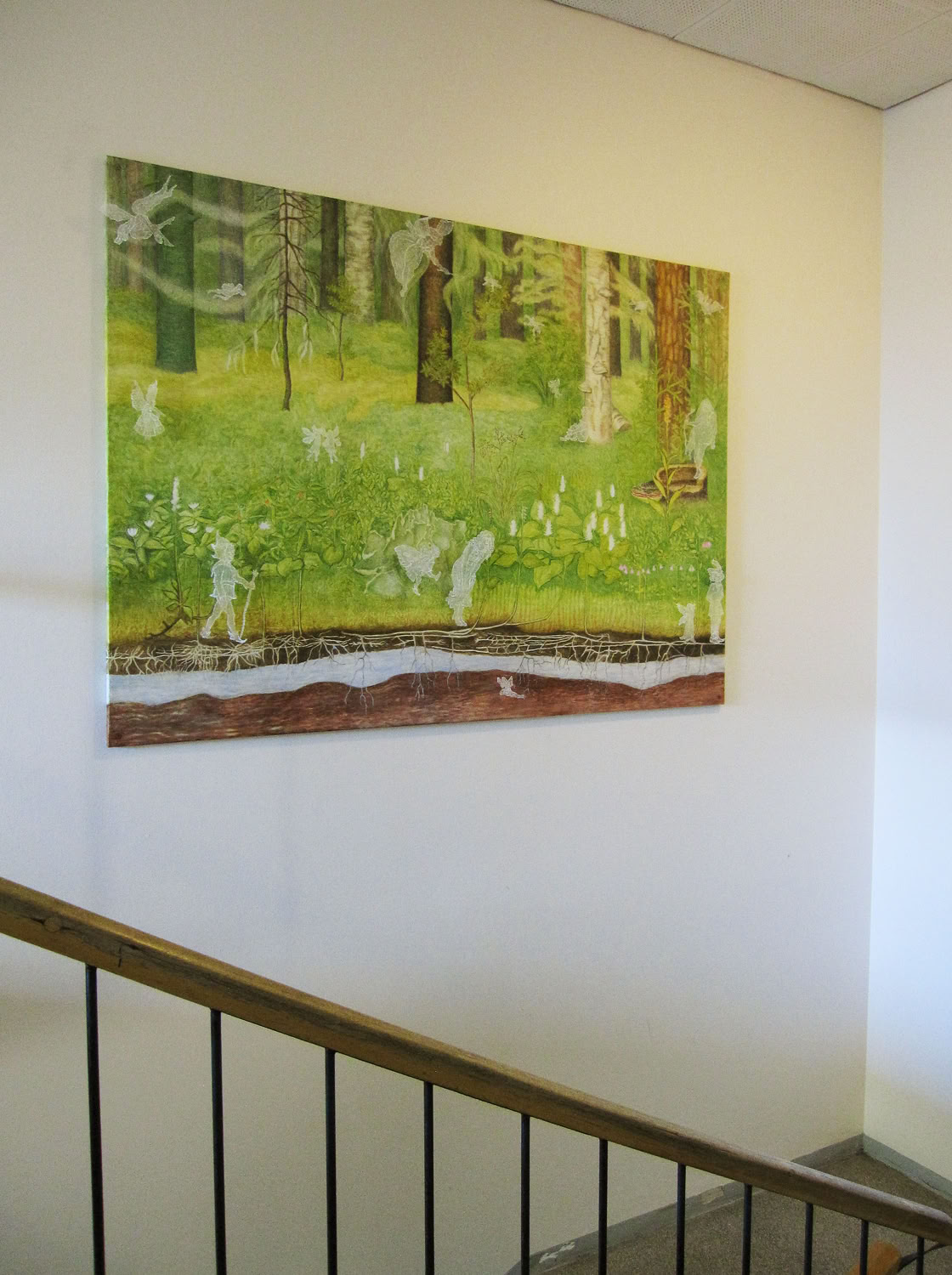 T. Kujala's fine painting (in 1947) for teaching shows a fresh coniferous forest of the blueberry type. It has served as a model for the fairy forest, linking the installation to the school world.