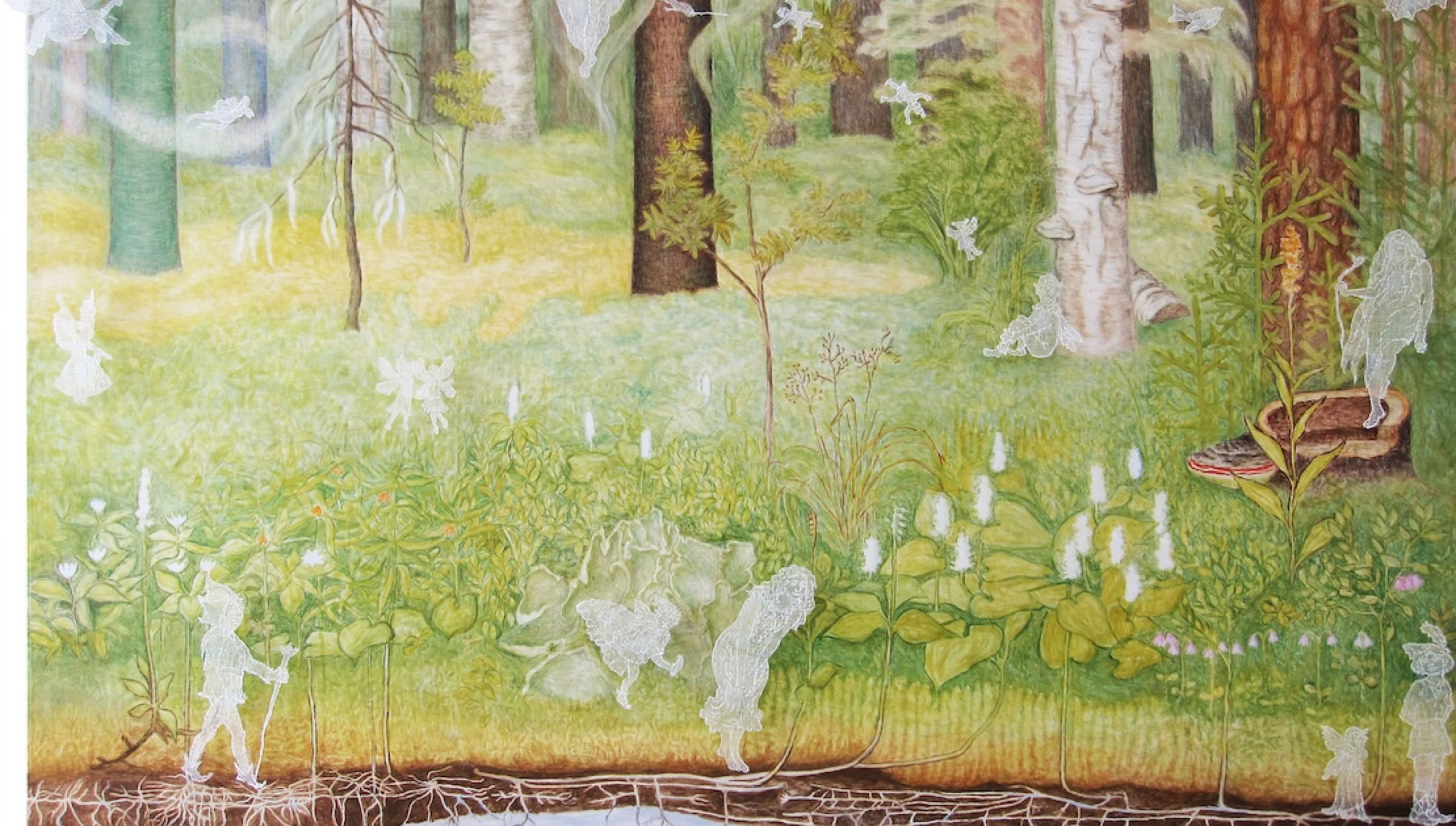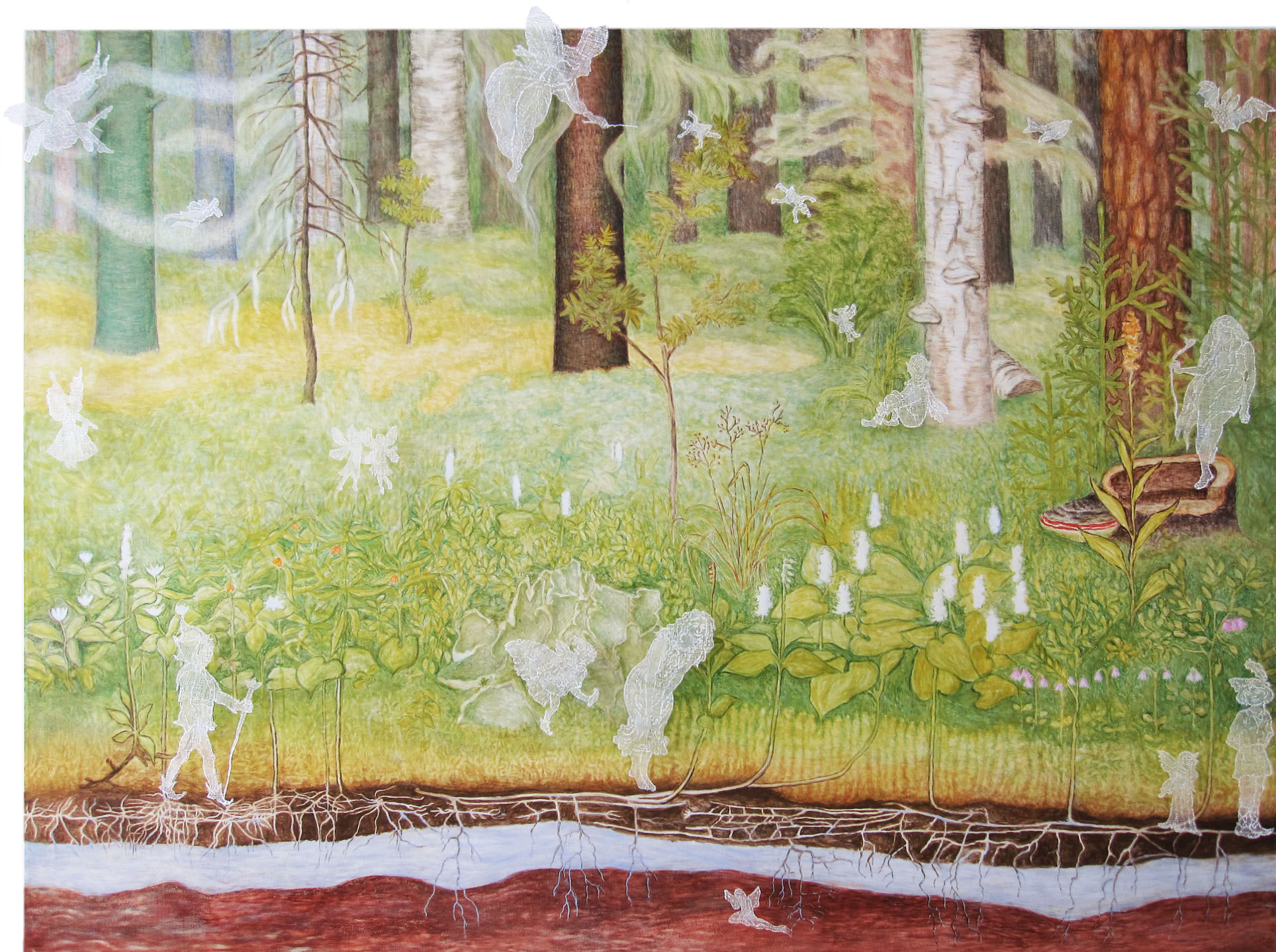 T. Kujala's fine painting (in 1947) for teaching shows a fresh coniferous forest of the blueberry type. It has served as a model for the fairy forest, linking the installation to the school world.