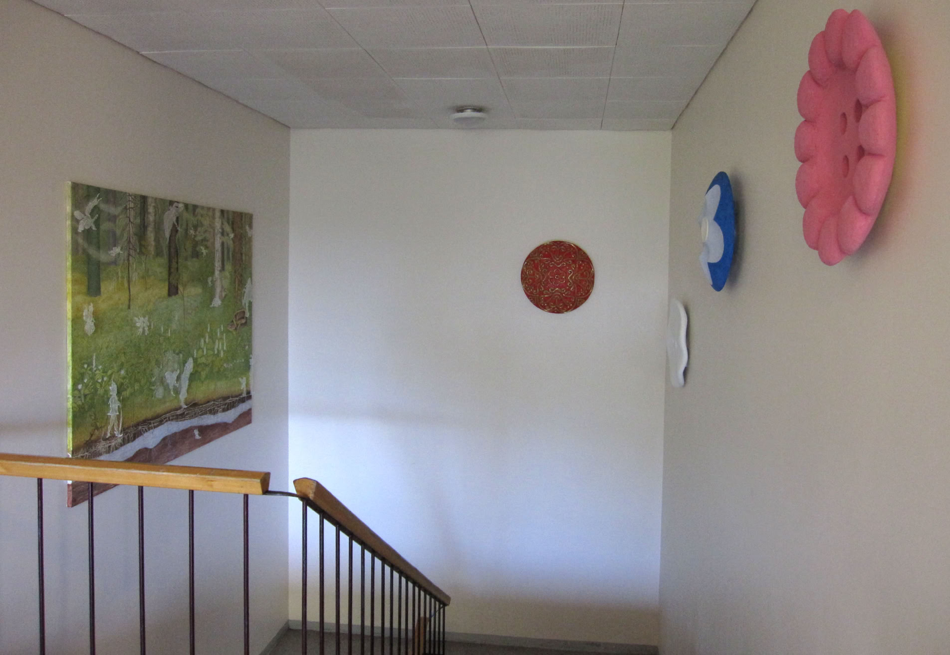 The school's staircase offers step-by-step shifting views and perspectives for the work. For example, the work entices you to play on scale, dive into the giant's pants or to do imaginative jumps under the protection of the queen's magic wand. A Finnish saying, everything is going great, "kaikki menee nappiin - everything goes to the button", is just true in the fairy forest.