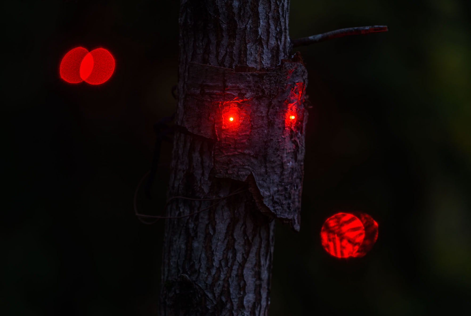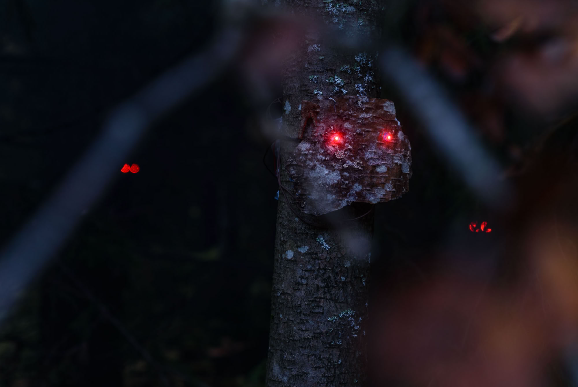 Forest beings consist of bark pieces that have fallen to the ground from rotting trees. The fragile bark is reinforced with gauze and plaster. Two pieces of LED light are embedded on each piece of bark as the eyes of the being. Forest beings are hung on trees at different hights.